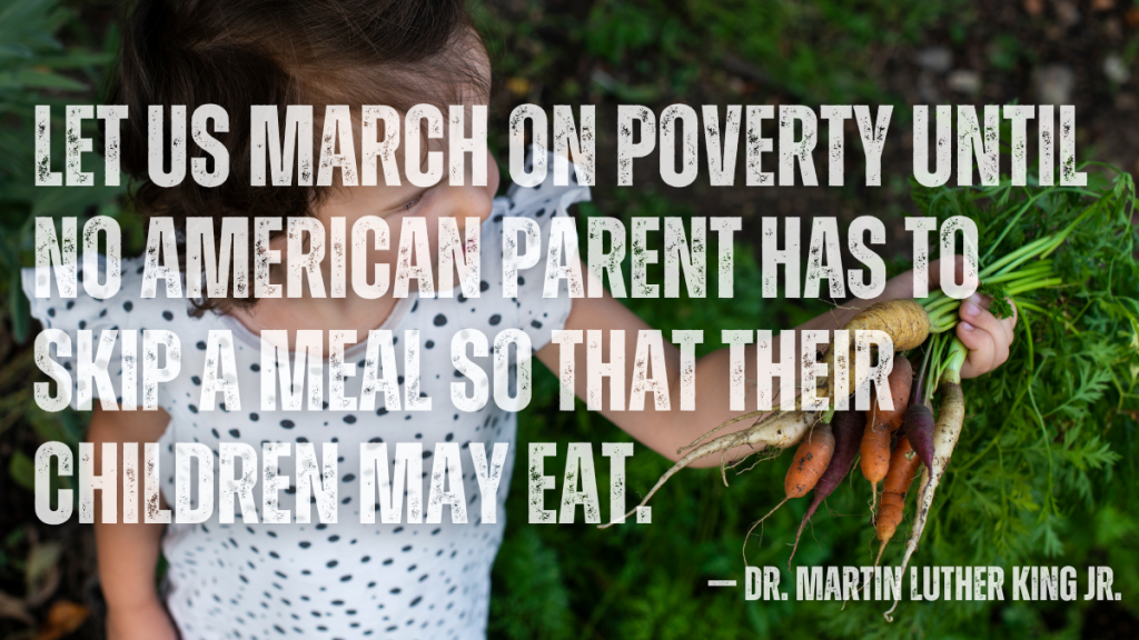 As we approach Dr. Martin Luther King Jr. Day on January 15th, we reflect on his powerful words regarding food insecurity in the United States. Dr. King once said, “Let us march on poverty until no American parent has to skip a meal so that their children may eat.” This call to action remains relevant today, as more than 34 million people, including 9 million children, in the United States continue to face food insecurity, with rural communities and families of color disproportionately affected.
